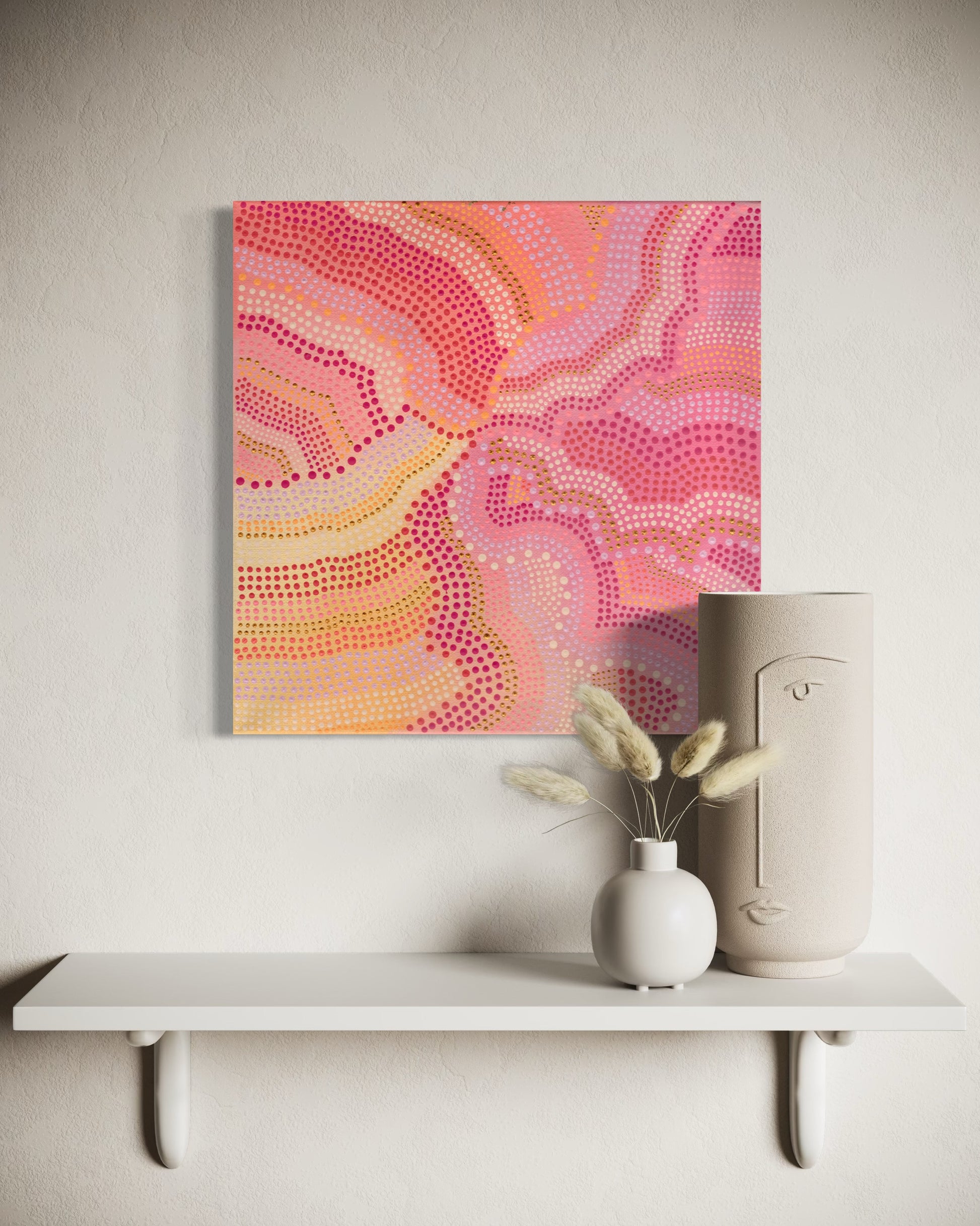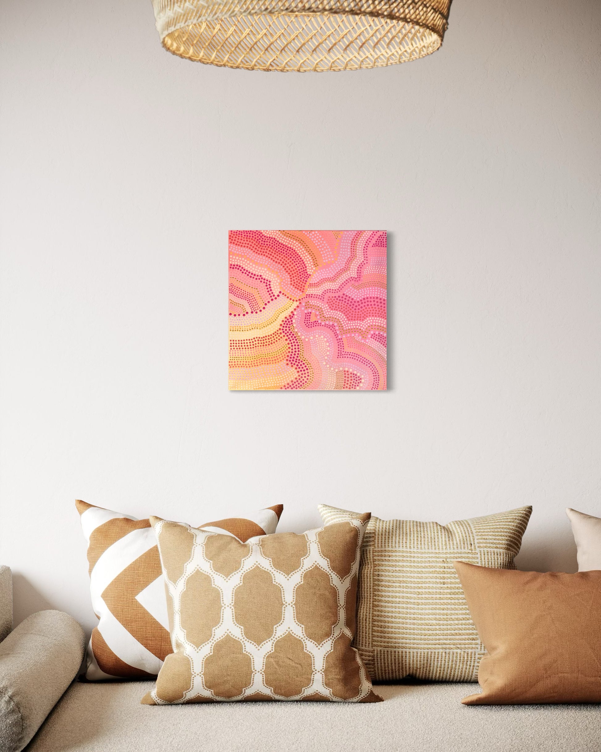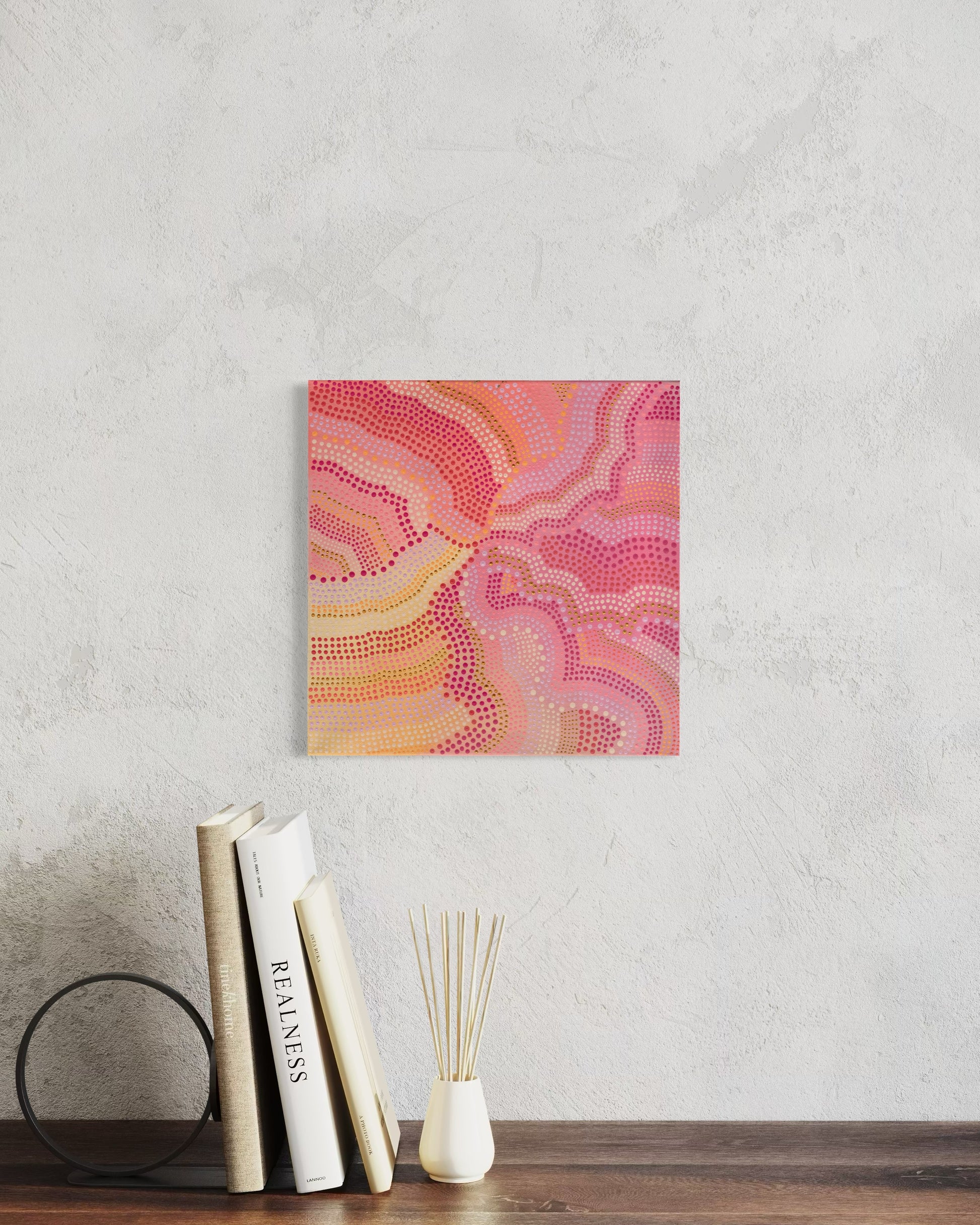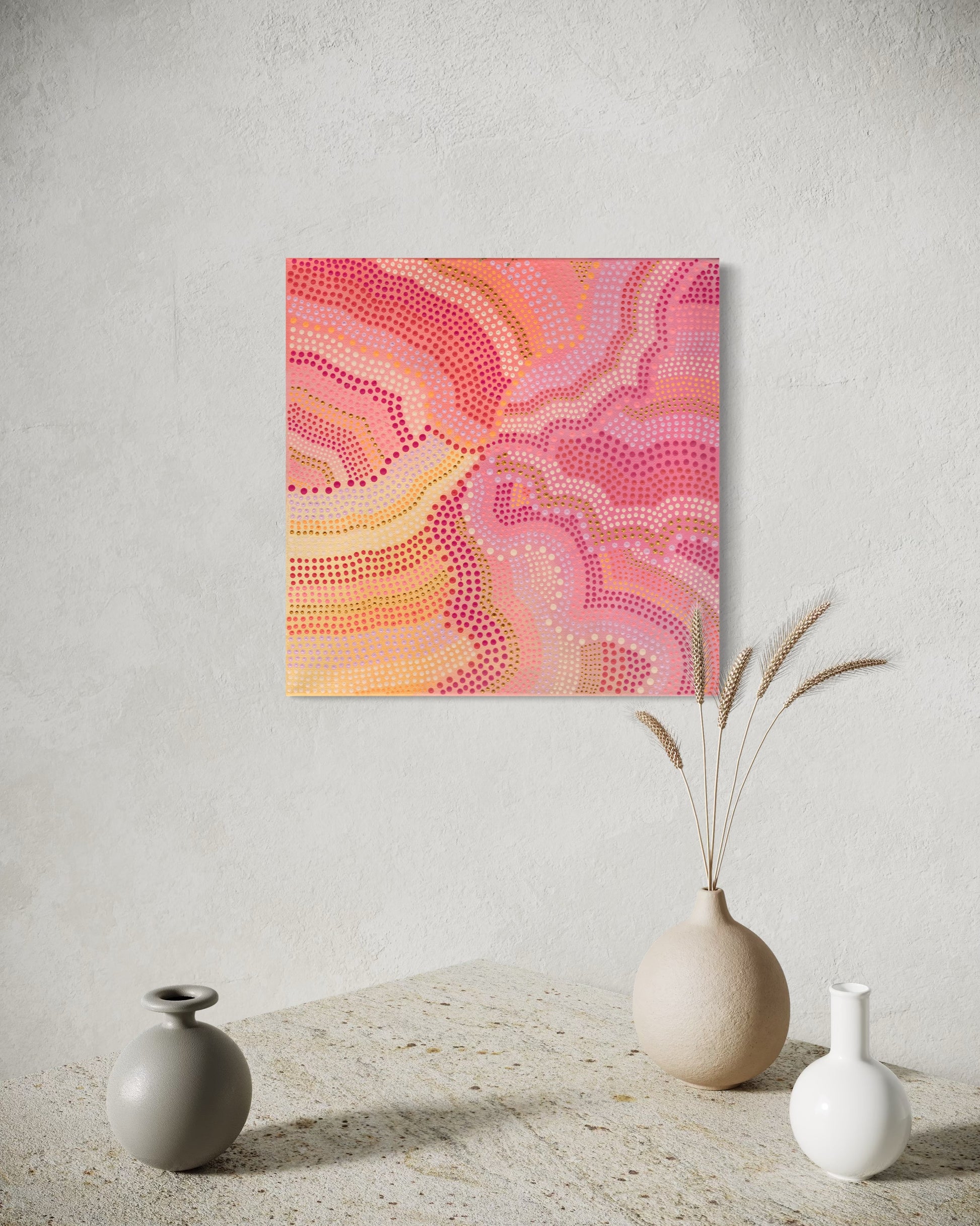 This painting represents Kaytetye country - Thangkenharenge, the traditional place name for Barrow Creek. As Kaytetye people, we are of this place. In this painting I have used colours inspired by sunrise and dot work to represent Country.