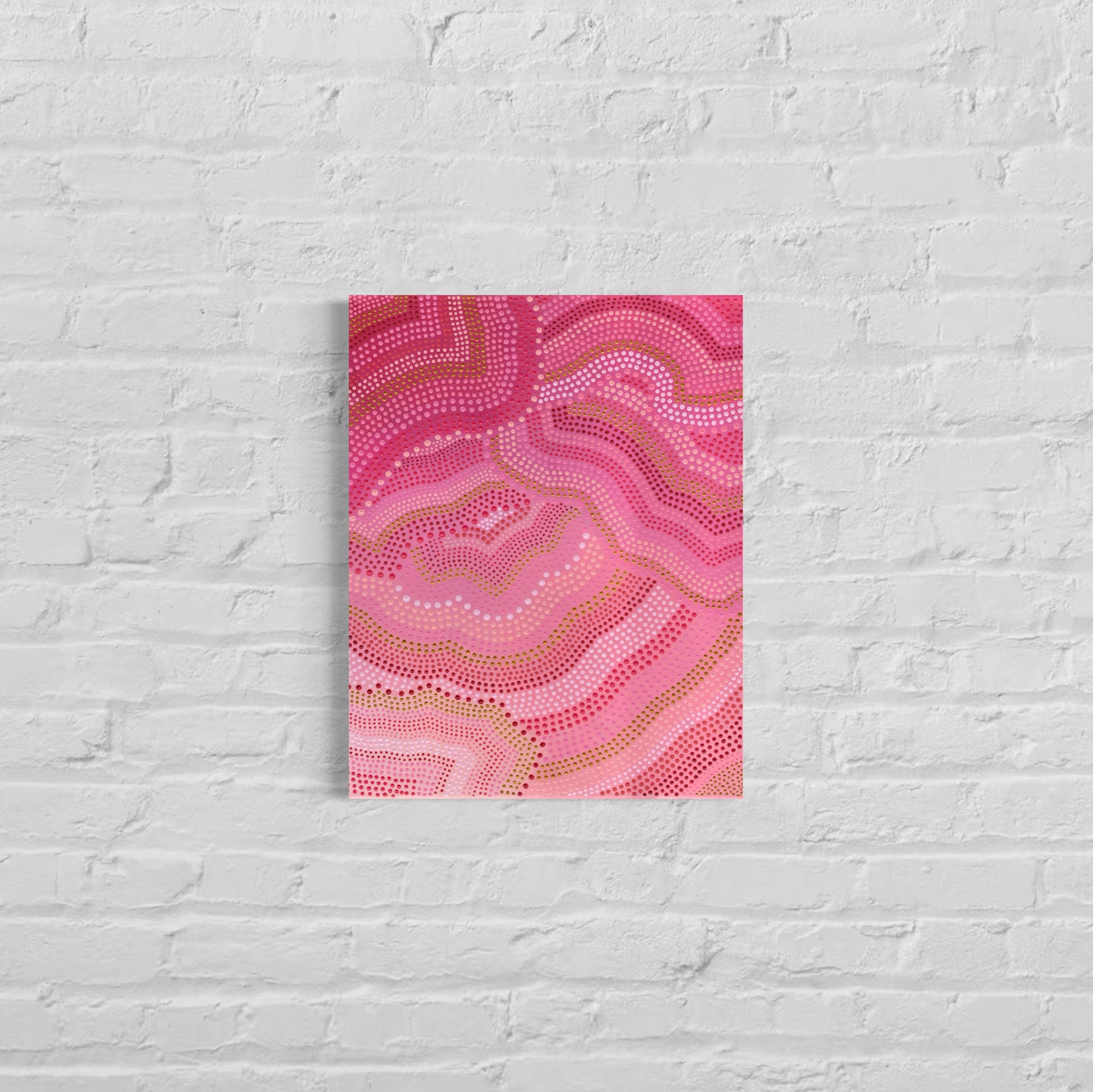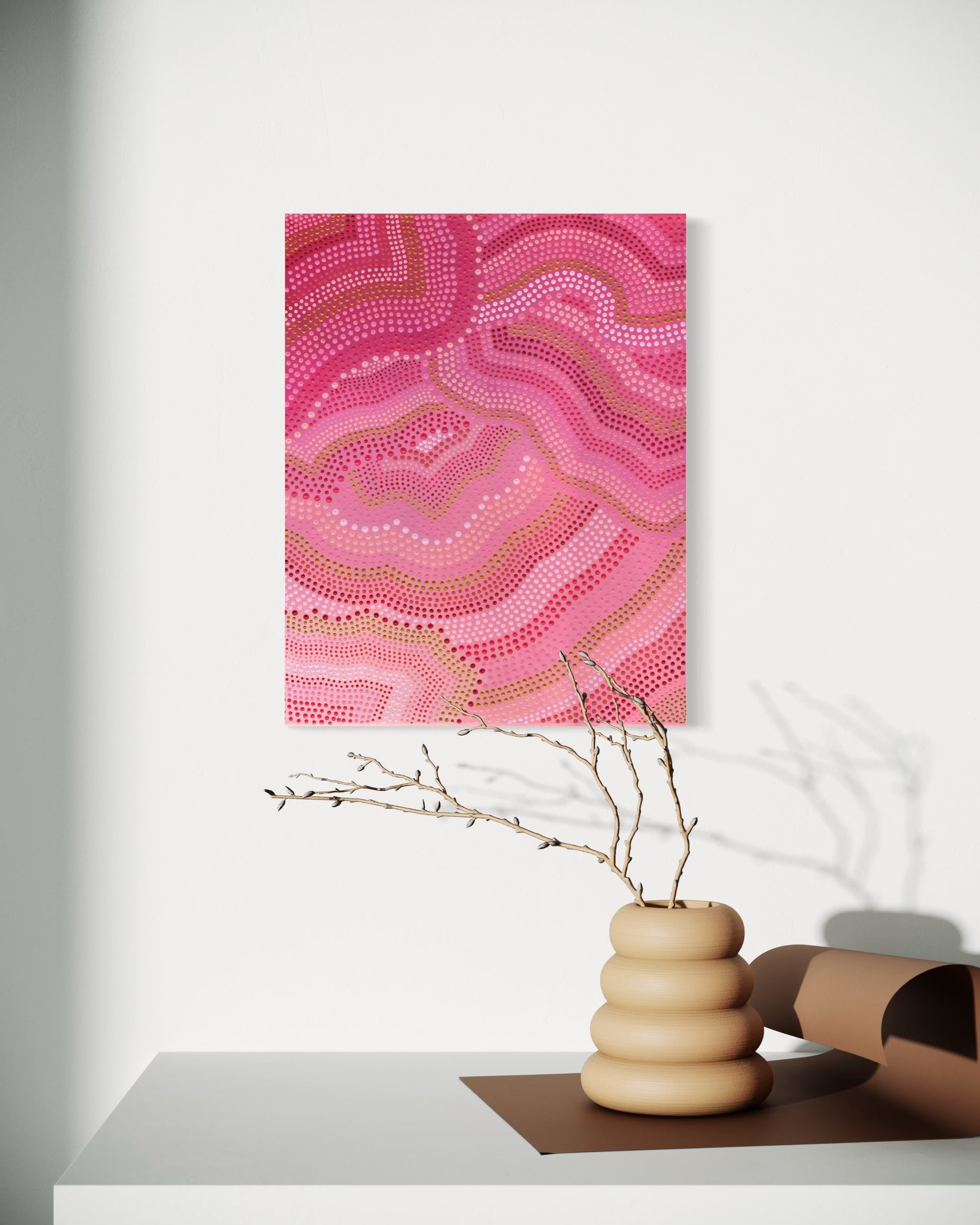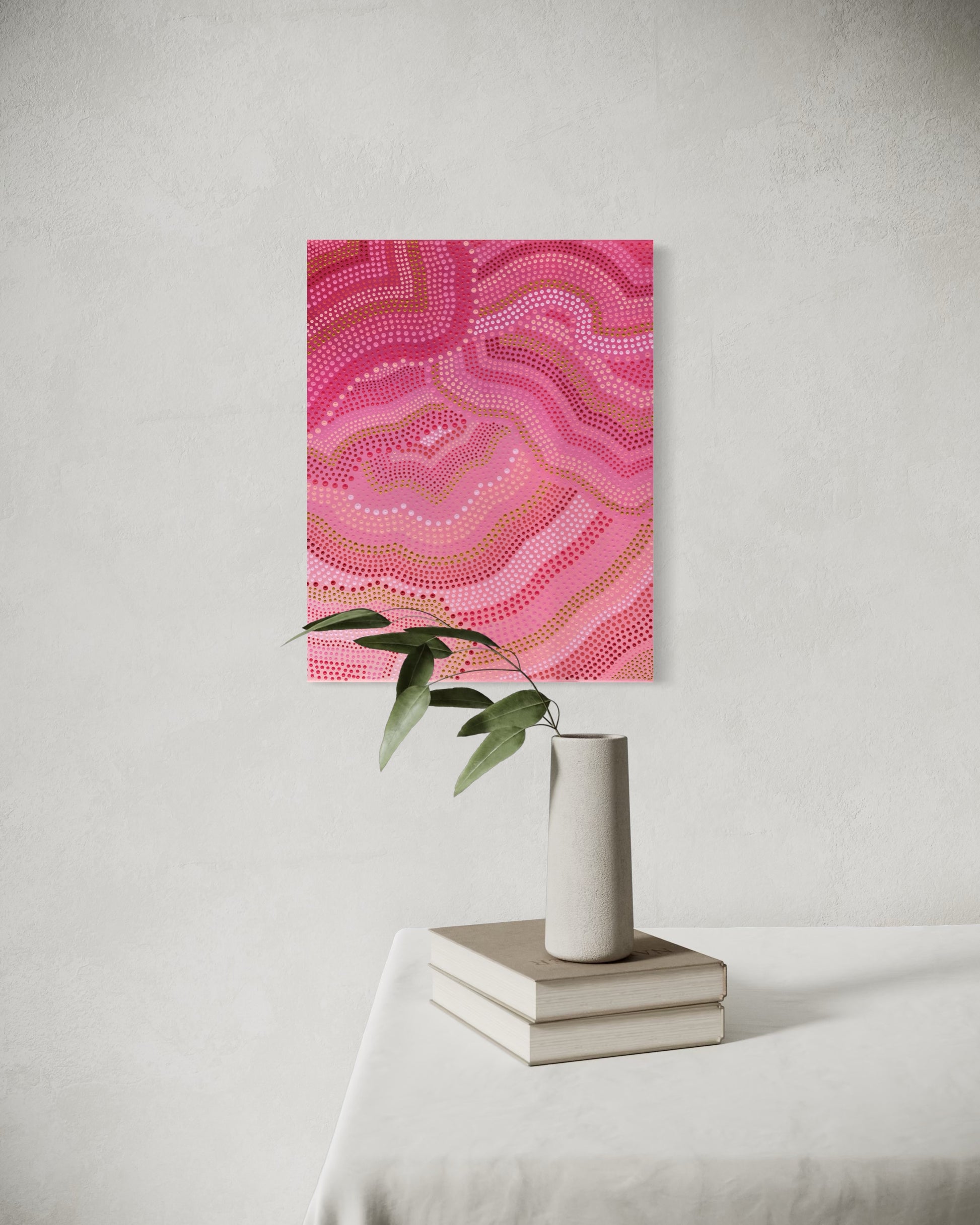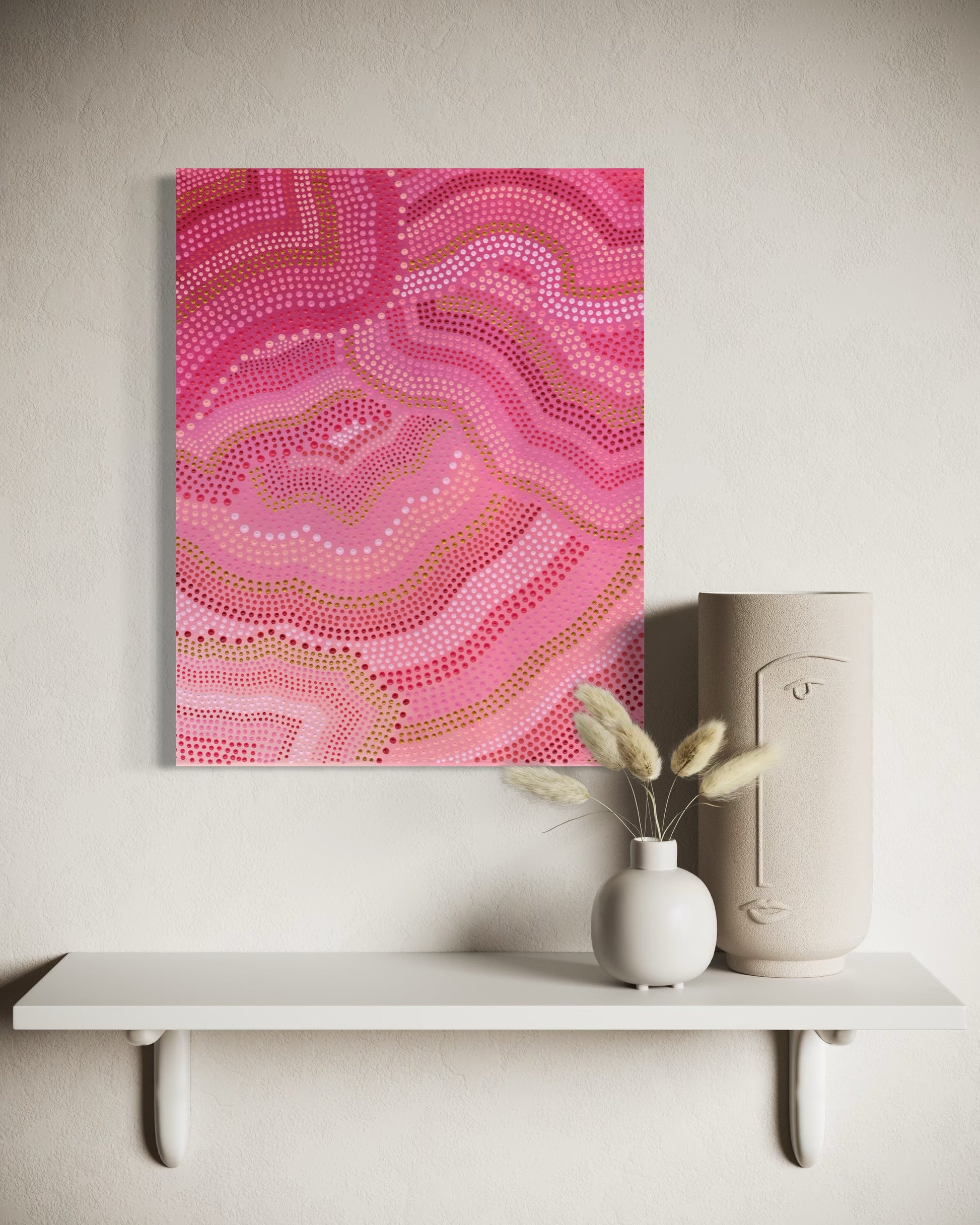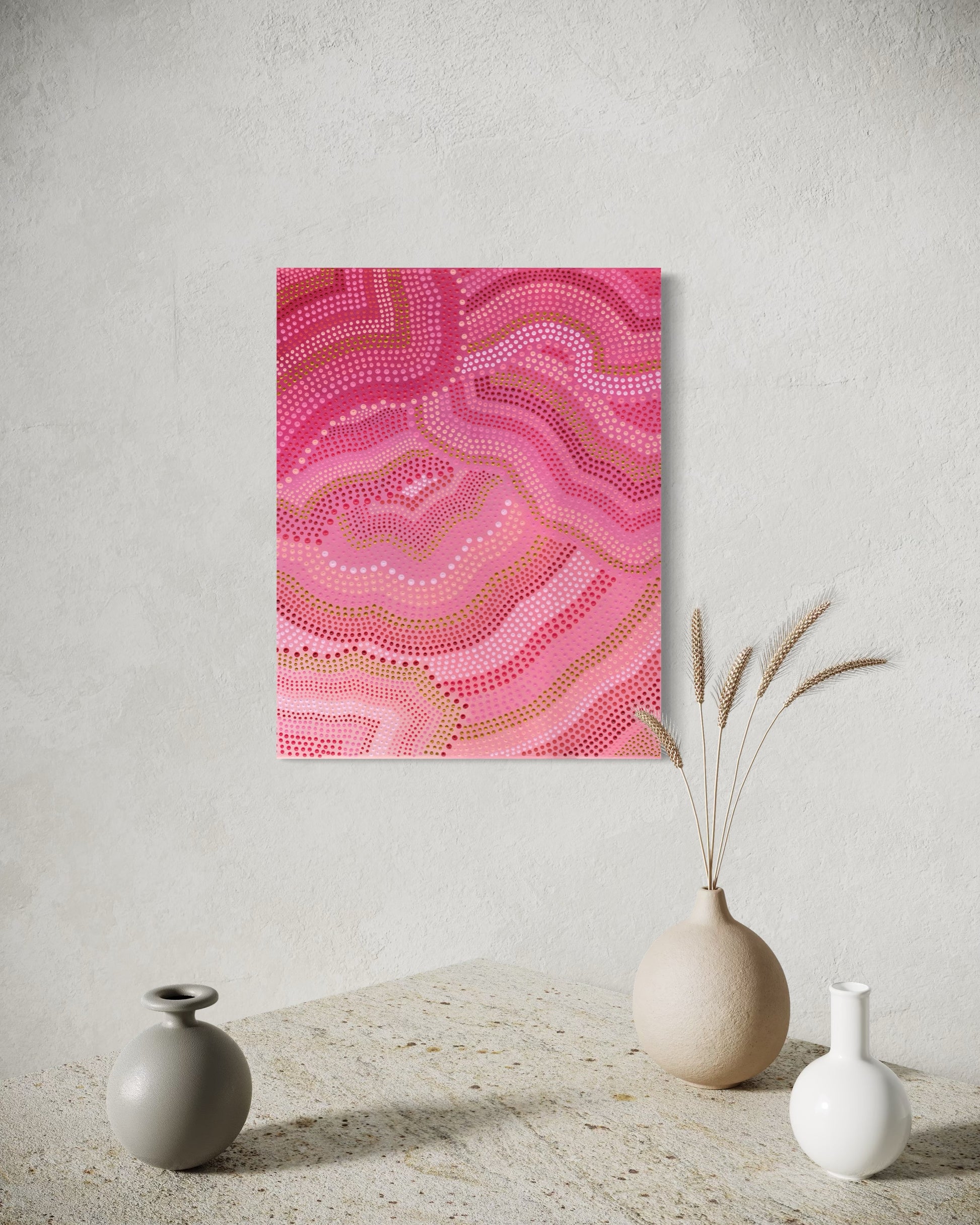 This painting represents Kaytetye country - Thangkenharenge, the traditional place name for Barrow Creek. As Kaytetye people, we are of this place. In this painting I have used bright pinks inspired by desert sunsets and dot work to represent Country.